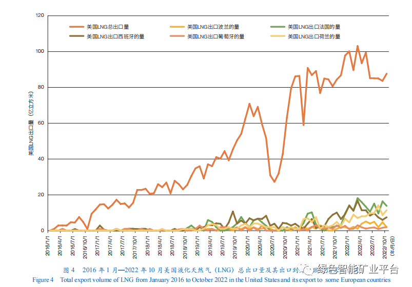 美國從危機中頻頻獲利,謀求能源統治。2022年上半年,美國LNG出口量平均為3.17億立方米/天,成為全球最大LNG出口國,近幾年美國LNG出口量持續增高(圖4);美歐達成協議,2022年美國對歐洲的天然氣出口將增加2/3,并將在2027年前助歐洲擺脫對俄能源依賴;美國成功搶奪歐洲能源市場,并將能源安全與地緣政治綁定。歐洲天然氣期貨結算價格不斷飆升,意味著脫離俄羅斯能源供應將大幅提高歐洲各國能源代價。