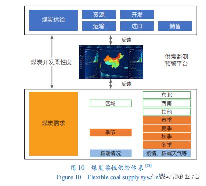 煤電與可再生能源優化組合保障供電穩定。與新一代信息技術緊密結合,建設5G通信+綠色智能開采、數字孿生智慧礦山、“供應鏈-物流鏈”雙鏈融合、消費精準預測、多源開放共享的市場交易機制(圖9)的煤炭柔性供給體系(圖10)。該體系與大容量、高參數、低污染的煤電機組及煤電靈活調峰技術,共同彌補可再生能源電力間歇性、隨機性和波動性的不足,保障電力系統平穩運行。