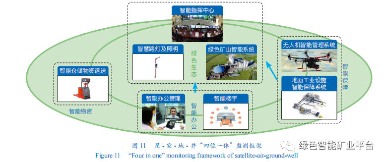 綠色開采技術的主要包括:基于地下水保護和地表生態減損的煤炭開采工藝及開采參數優化方法,建立針對我國東、中、西部不同采煤區域的地表植被修復技術、星-空-地-井“四位一體”監測技術(圖11),以此建立多源異構礦區生態擾動監測大數據融合處理與知識挖掘理論體系。