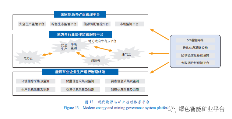 將5G通信網絡、智能云、區塊鏈、大數據等新一代信息技術應用到國家能源與礦業管理平臺、地方與行業協作監管服務平臺和能源礦業企業生產運行治理終端,形成現代能源與礦業治理體系平臺(圖13),實現礦業產業全過程的智慧化運行。