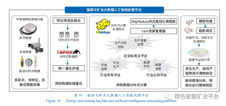 能源與礦業大數據人工智能處理平臺。構建以智能柔性能源與礦物供給終端為基礎的能源與礦業大數據人工智能處理平臺(圖16),采集多層次、多特征和多模式數據,統一異構數據存儲量化和分布式計算,提供安全生產、儲裝運、高效轉化、消費需求精準分析及預測,支撐現代能源與礦業智能柔性開發供給體系高效可靠運行,實現對能源生產交易數據的有效分析。