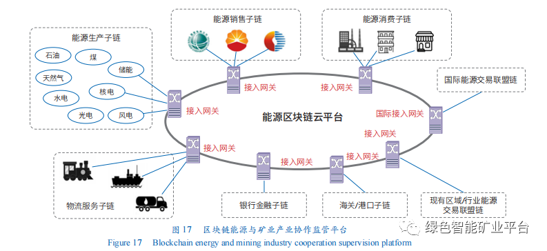 區塊鏈能源與礦業產業協作監管平臺。依據參與方角色分別建立能源生產、銷售、消費子鏈,通過接入網關實現區塊聯盟鏈,實現國內外能源與礦業自由交易及監管數據的可信記錄。物流服務、銀行金融、海關/港口等子鏈也通過網關接入能源區塊鏈平臺,并形成現有區域/行業的能源交易聯盟鏈。通過接入國際網關,將國際能源交易聯盟鏈也接入能源區塊鏈平臺,為國家監控提供數據接口(圖17)。