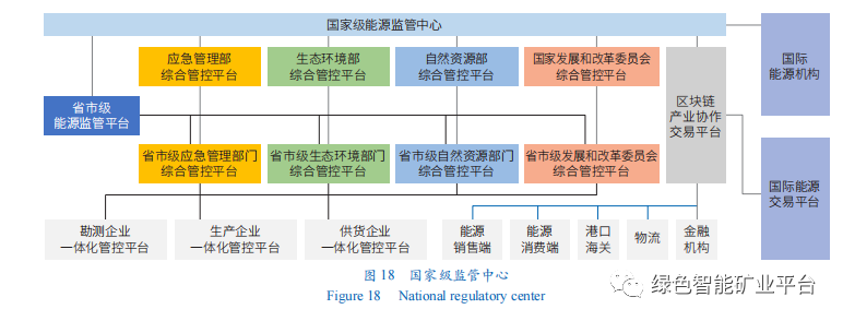建設涵蓋能源與礦業生產交易各環節的省級管控平臺、國家級監管中心。助力企業實現科學微觀管理,增強政府相關管理部門之間的協同(圖18),解決能源監管缺位錯位難題,保障能源安全生產等。打造區塊鏈產業協作平臺,打通產業鏈合作瓶頸,加強市場引導力度;同時,與國家能源機構、能源與礦業交易平臺建立互通手段,增強我國能源與礦業國際話語權。